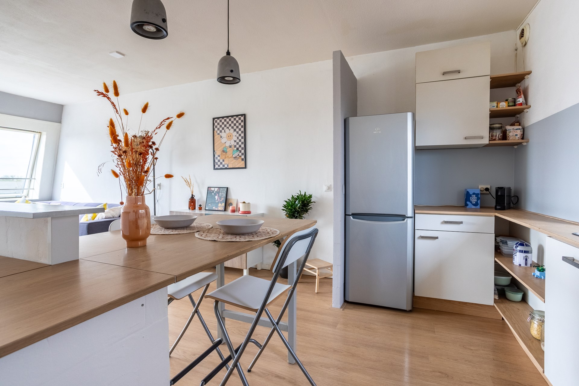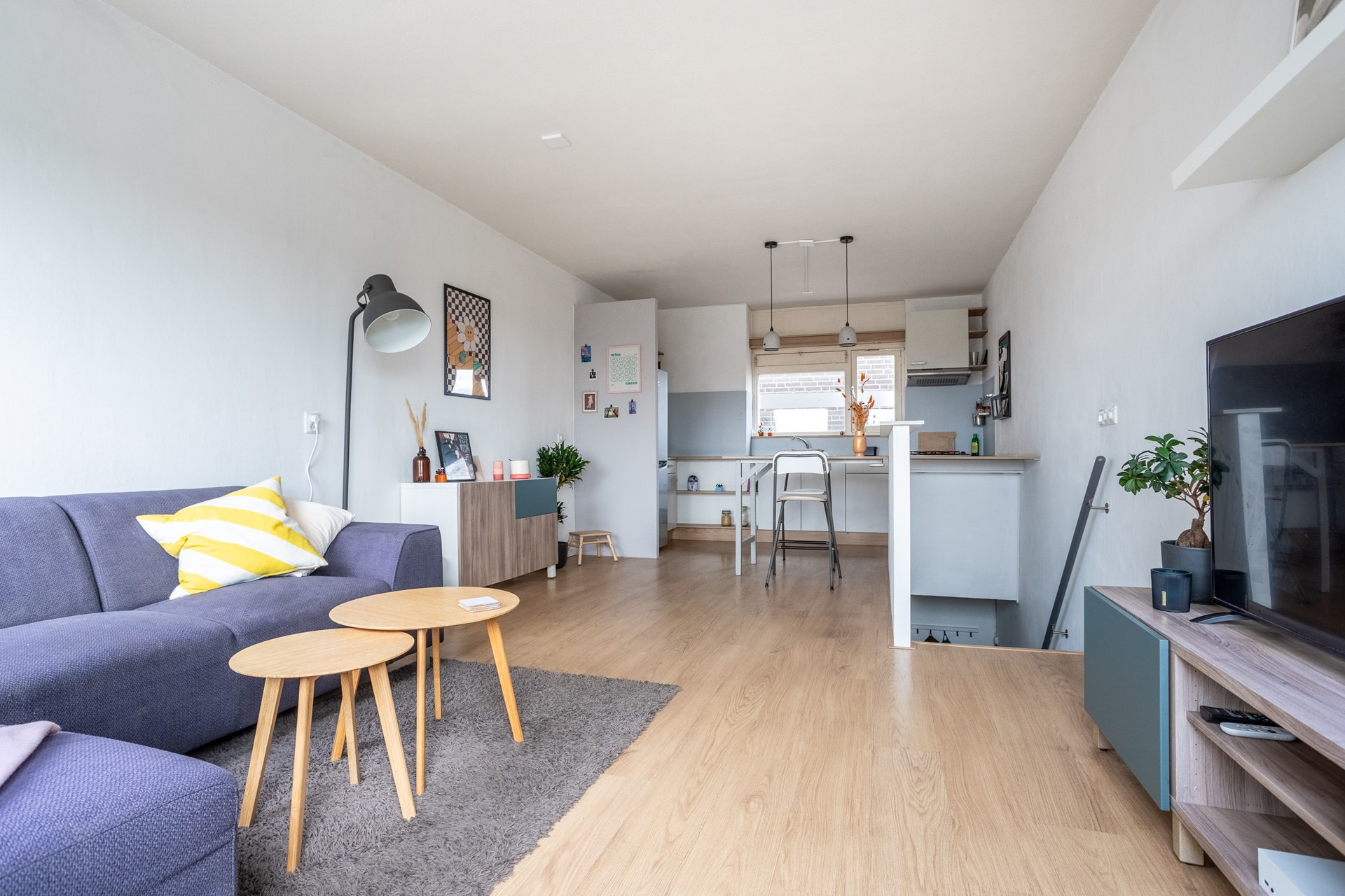 De ruime woonkamer met grote ramen zorgt direct voor een prettige, lichte sfeer. De open keuken sluit naadloos aan op de woonkamer. Deze is neutraal maar sober van inrichting - wellicht ideaal om deze direct naar eigen smaak in te richten.